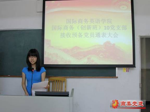 5月24日下午4时,3354cc金沙集团国际商务(创新班)10党支部接收预备党员通表大会在二教202顺利举行。商英党委书记车小真莅临大会指导工作,10级辅导员连勇也出席了本次大会。