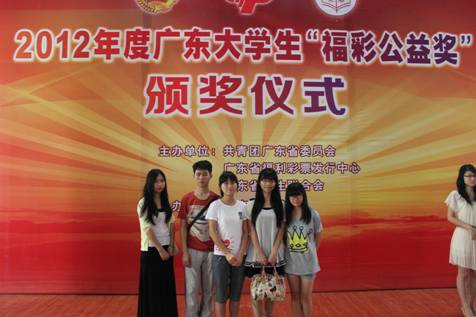省民政厅厅长刘洪、团省委书记曾颖如、团省委池志雄副书记、省福彩发行中心主任黄严冰出席颁奖仪式,并为获奖团队及个人进行颁奖。2012年度广东大学生“福彩公益奖”活动自启动以来,共得到全省130多所各级各类高校及社会组织、1300多支大学生公益团队的响应和参与,我校共36个团队申报开展福彩公益奖项目,16支团队获此殊荣。